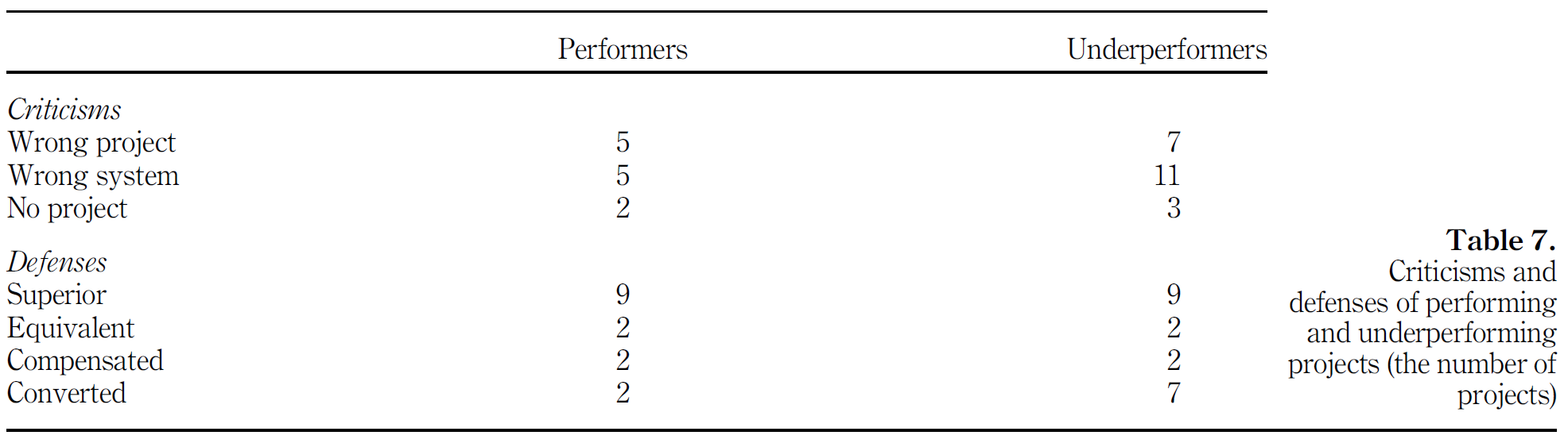 We also looked at how proponents and critics of a project described it outcomes. First, not surprisingly, projects that formally underperform are criticized more frequently. Interesting though is that even underperforming projects are vigorously defended by their proponents (we shall take a look at the arguments in a second).